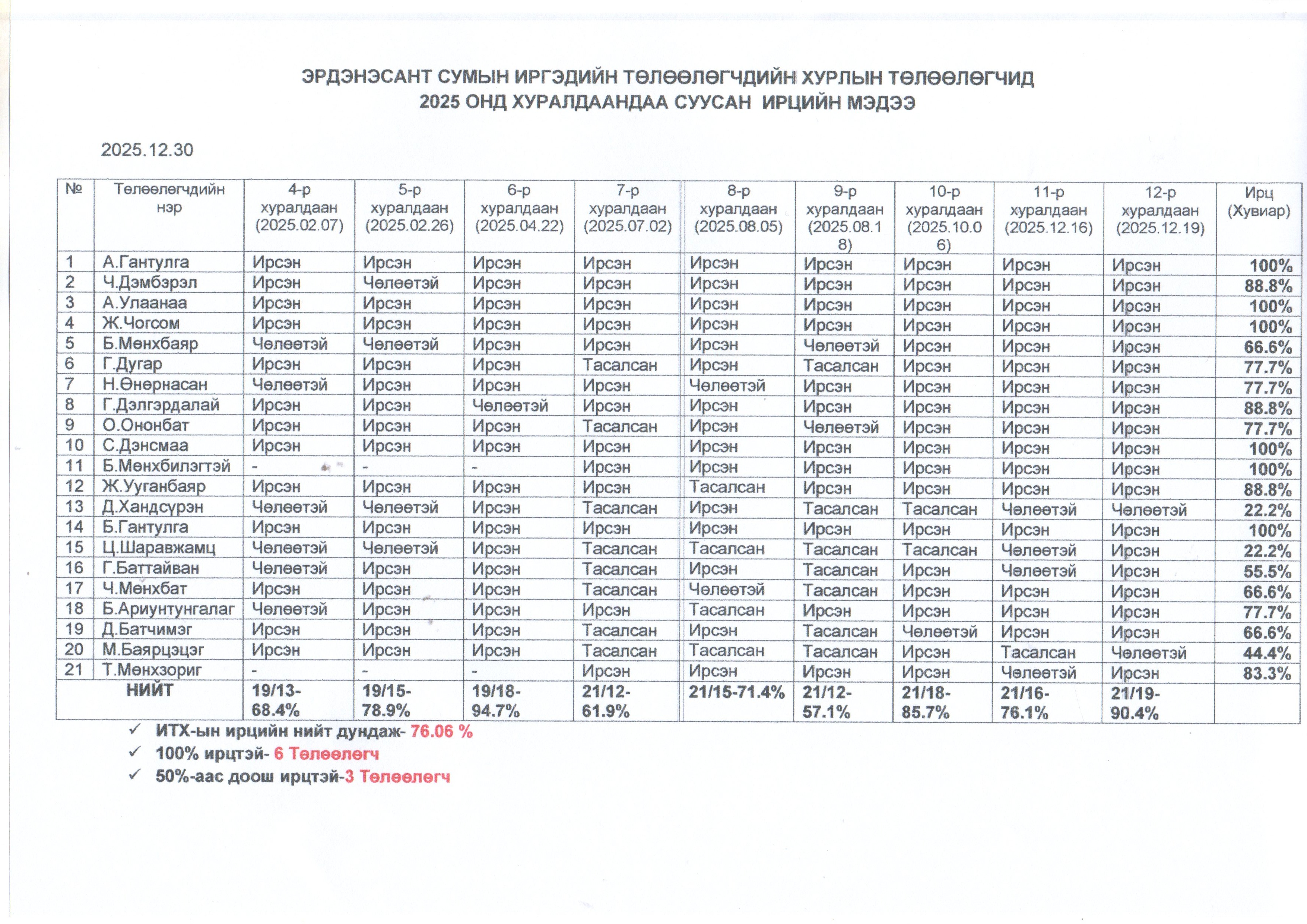 ЭРДЭНЭСАНТ СУМЫН ИРГЭДИЙН ТӨЛӨӨЛӨГЧДИЙН ХУРЛЫН ТӨЛӨӨЛӨГЧИД 2025 ОНД ХУРАЛДААНДАА СУУСАН ИРЦИЙН МЭДЭЭ